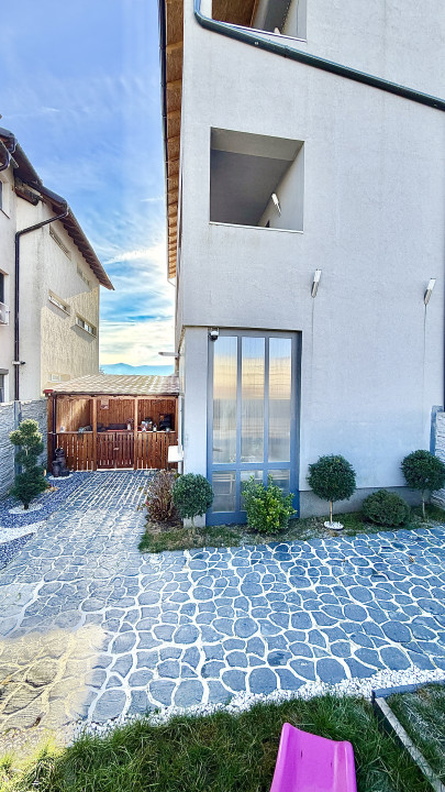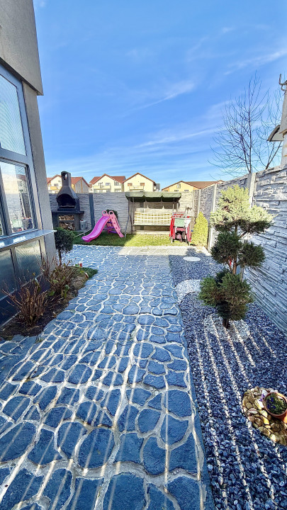 - Gazon impecabil, copaci ornamentali naturali și o fântâniță cu apă;